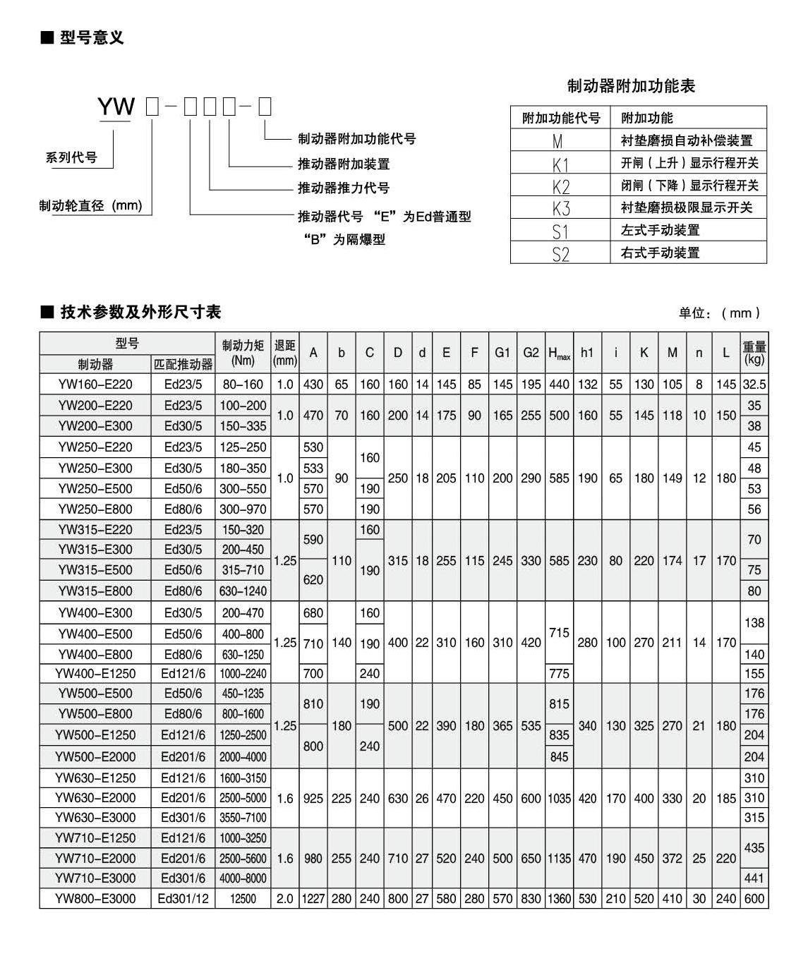 應(yīng)用:YW,YWZ13系列電力液壓鼓式制動器,廣泛應(yīng)用于有防爆要求的各種起重運輸、皮帶運輸、港口裝卸、冶金及建筑機械中各種機構(gòu)的減速和停車(維持)制動。符合標(biāo)準:YW,YWZ13系列電力液壓鼓式制動器的連接尺寸和技術(shù)要求符合JB / T6406-2006標(biāo)準;制動力矩參數(shù)符合DIN15435標(biāo)準,配套符合DIN15430標(biāo)準的Ed系列推動器。主要特點:▲ 聯(lián)鎖式退距均等裝置和瓦塊自動隨位裝置,可始終保持兩側(cè)瓦塊退距均等且無需調(diào)整,完全避免因退距不均使一側(cè)制動襯墊浮貼制動輪的現(xiàn)象;▲ 主要擺動鉸點均設(shè)有自潤滑軸承,傳動效率高,壽命長,使用中無需潤滑;▲ 制動彈簧在方管內(nèi)布置并設(shè)有標(biāo)尺,用戶可十分方便地讀出制動力矩值,免去測量和計算的麻煩;▲ 制動襯墊為卡裝式整體成型結(jié)構(gòu),更換十分方便、快捷,備有半金屬(無石棉)硬質(zhì)和半硬質(zhì),軟質(zhì)(無石棉)等不同材質(zhì)的制動襯墊供用戶選擇;▲ 配套Ed系列電力液壓推動器產(chǎn)品,動作靈敏、使用壽命長;▲ 常閉式設(shè)計,(斷電)彈簧制動,(通電)推動器釋放。工作條件:◆ 海拔高度:<2000m;◆ 環(huán)境溫度:-20°C?+ 40°C;◆ 相對濕度:≤90%;◆ 工作制:間歇性(S3-60%)和連續(xù)(S1);◆ 電源電壓:三相交流,AC380 50Hz (其他電源等級可按需要定制);◆ 有特殊要求時在訂貨時協(xié)商確定?;緟?shù):● 產(chǎn)品型號:YW-160、YW-200、YW-250、YW-315、YW-400、YW-500、YW-630、YW-710、YW-800● 適用輪徑:160~800mm● 制動力矩:80~12500Nm● 產(chǎn)品型號:YWZ13-200、YWZ13-250、YWZ13-315、YWZ13-400、YWZ13-500、YWZ13-630、YWZ13-710、YWZ13-800● 適用輪徑:200~800mm● 制動力矩:80~12500Nm